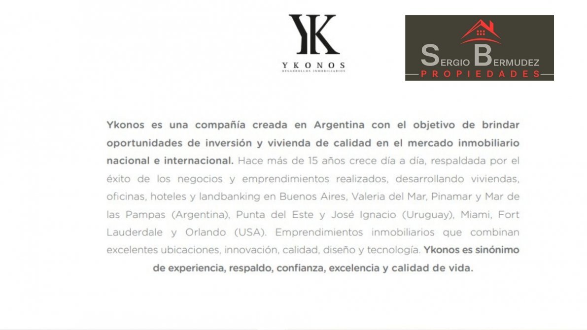 Ykonos es una compañía creada en Argentina con el objetivo de brindar oportunidades de inversión y vivienda de calidad en el mercado inmobiliario nacional e internacional. Hace más de 15 años crece día a día, respaldada por el éxito de los negocios y emprendimientos realizados, desarrollando viviendas, oficinas, hoteles y landbanking en Buenos Aires, Valeria del Mar, Pinamar y Mar de las Pampas (Argentina), Punta del Este y José Ignacio (Uruguay), Miami, Fort Lauderdale y Orlando (USA). Emprendimientos inmobiliarios que combinan excelentes ubicaciones, innovación, calidad, diseño y tecnología. Ykonos es sinónimo de experiencia, respaldo, confianza, excelencia y calidad de vida.